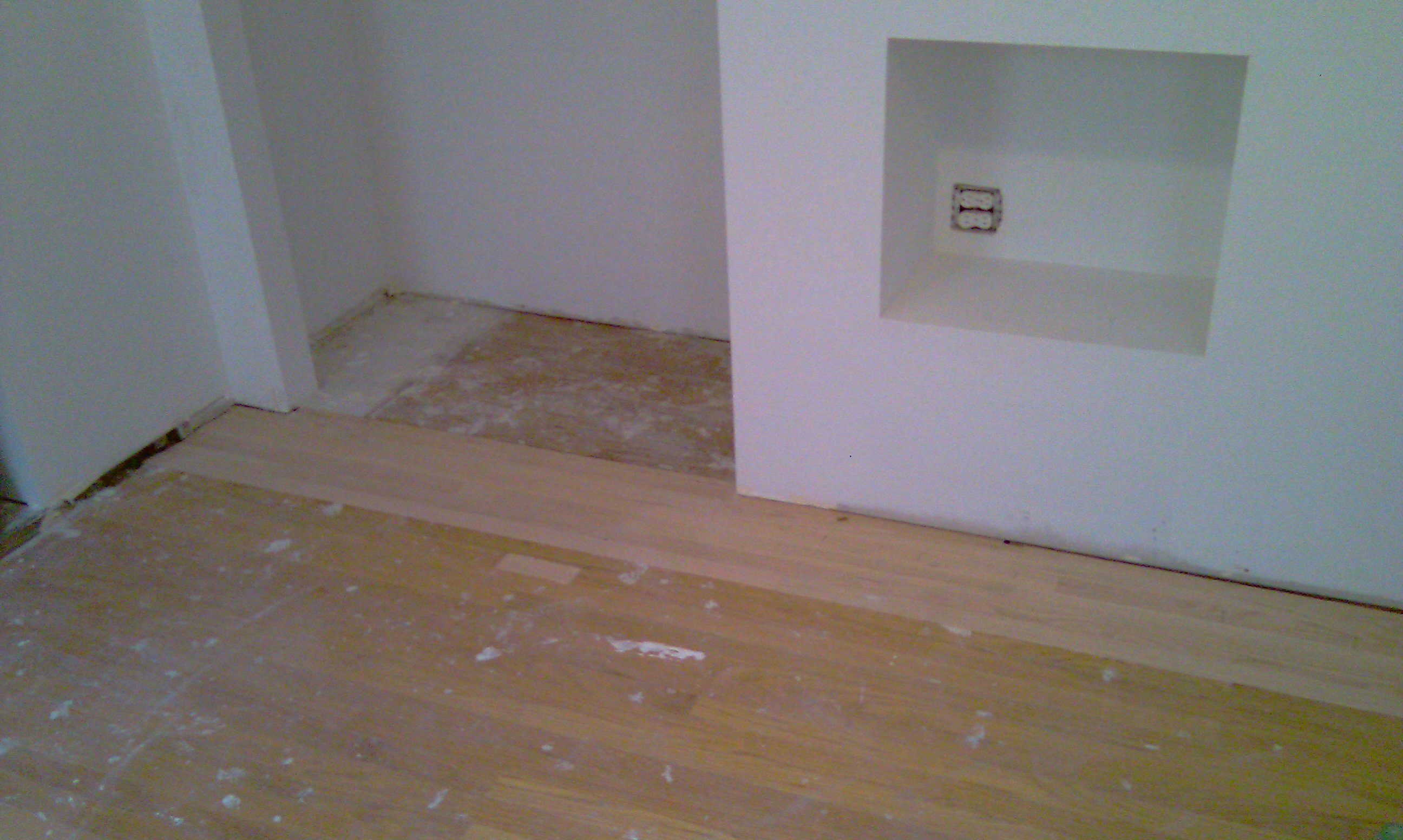 We cut damaged wood out and leveled the sub-floor so that the repaired floor would stand on the same level as the preexistent flooring.